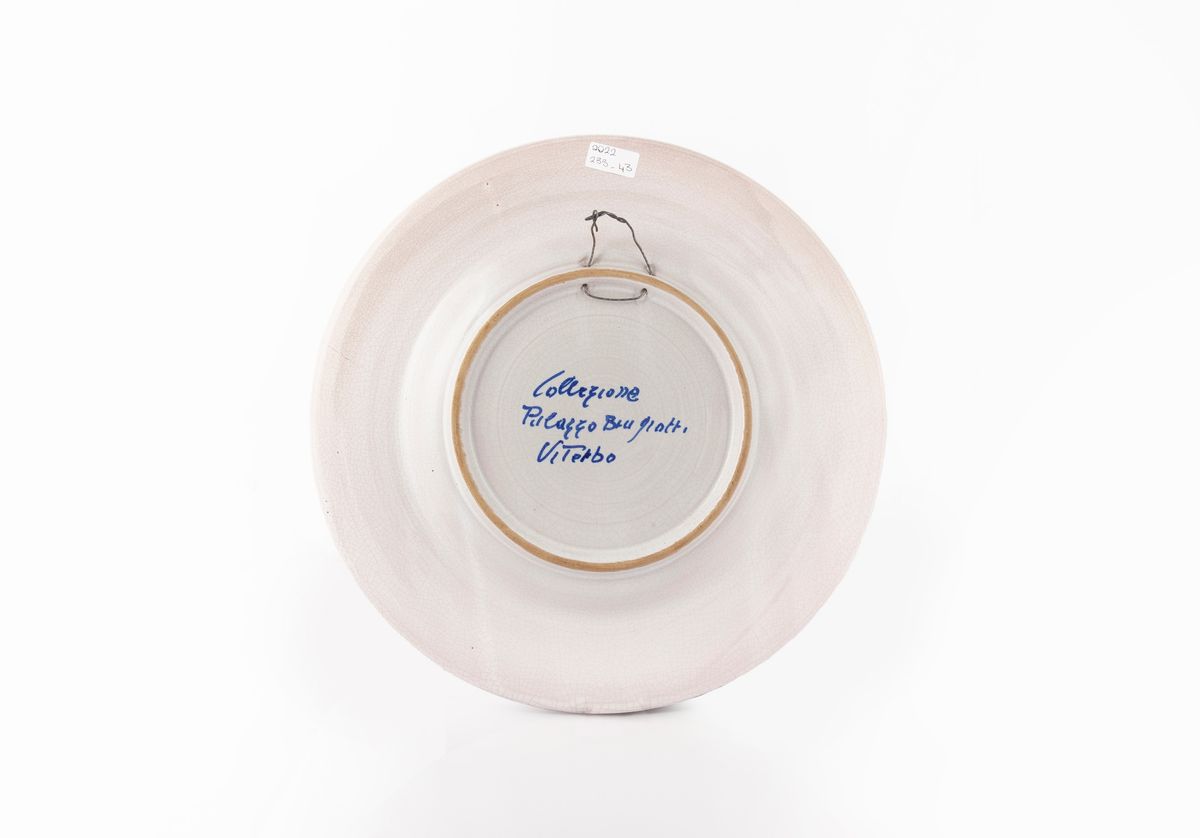 replica di un piatto nel Museo della ceramica della Tuscia, decorato in blu, verde e arancio, centrato da figure di leone; tesa percorsa da motivi geometrici nei medesimi toni cromatici. Iscritto al verso: Collezione Palazzo Brugiotti Viterbo