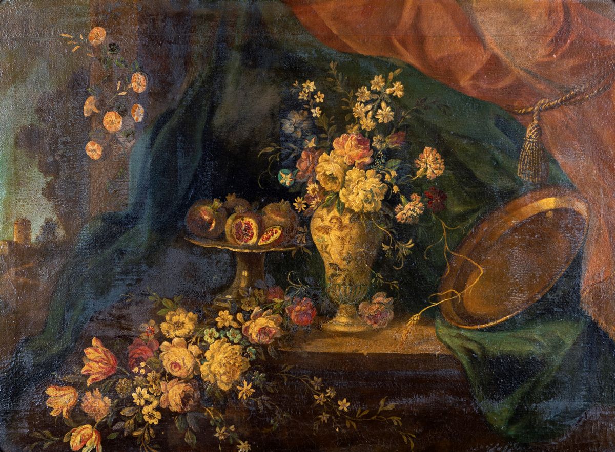 Natura morta di fiori e melagrane