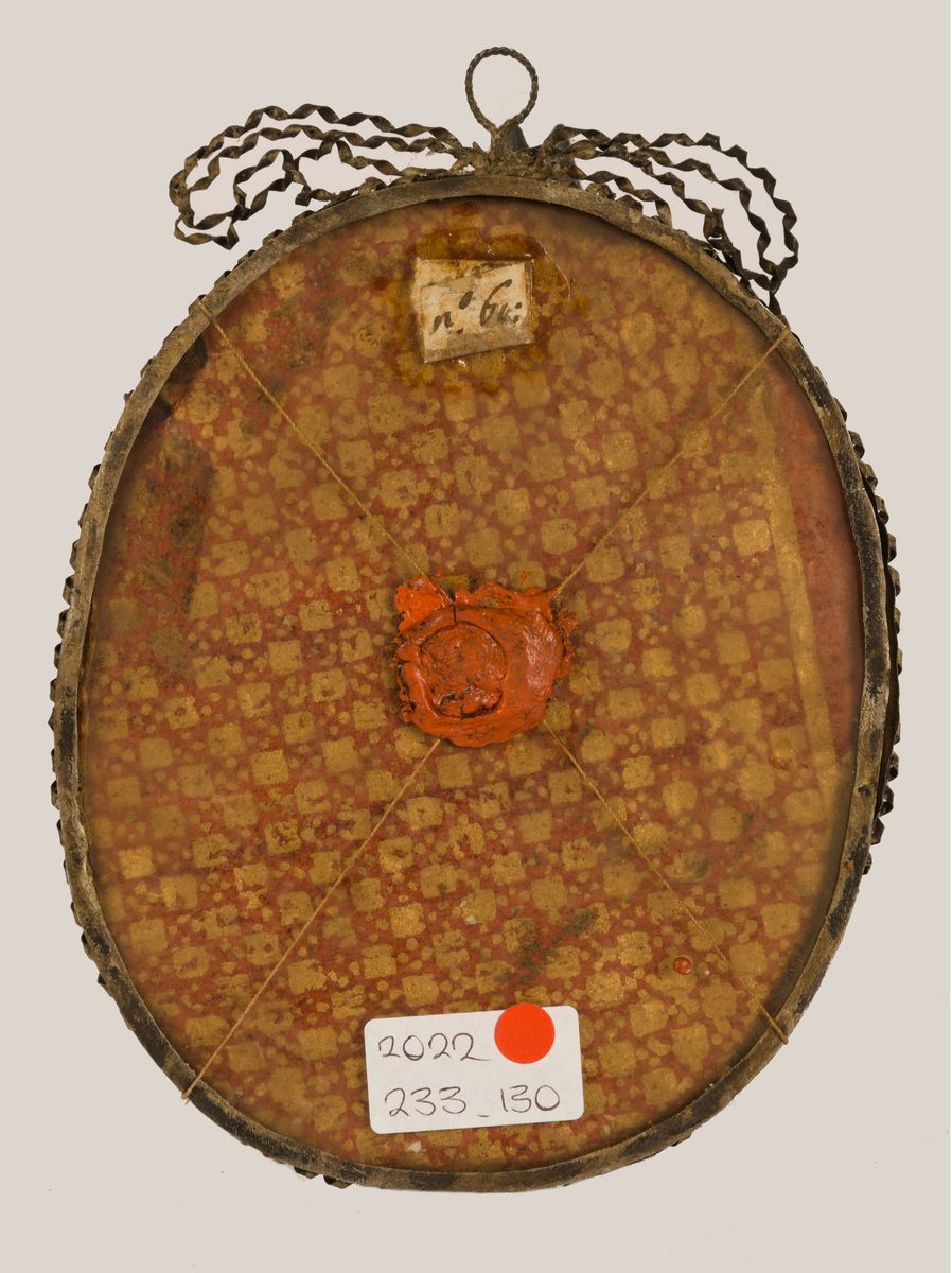 di forma ovale contenente 31 reliquie; la struttura è impreziosita da un sottile listello ad andamento elicoidale culminante sulla sommità in un fiocco; al verso timbro di ceralacca