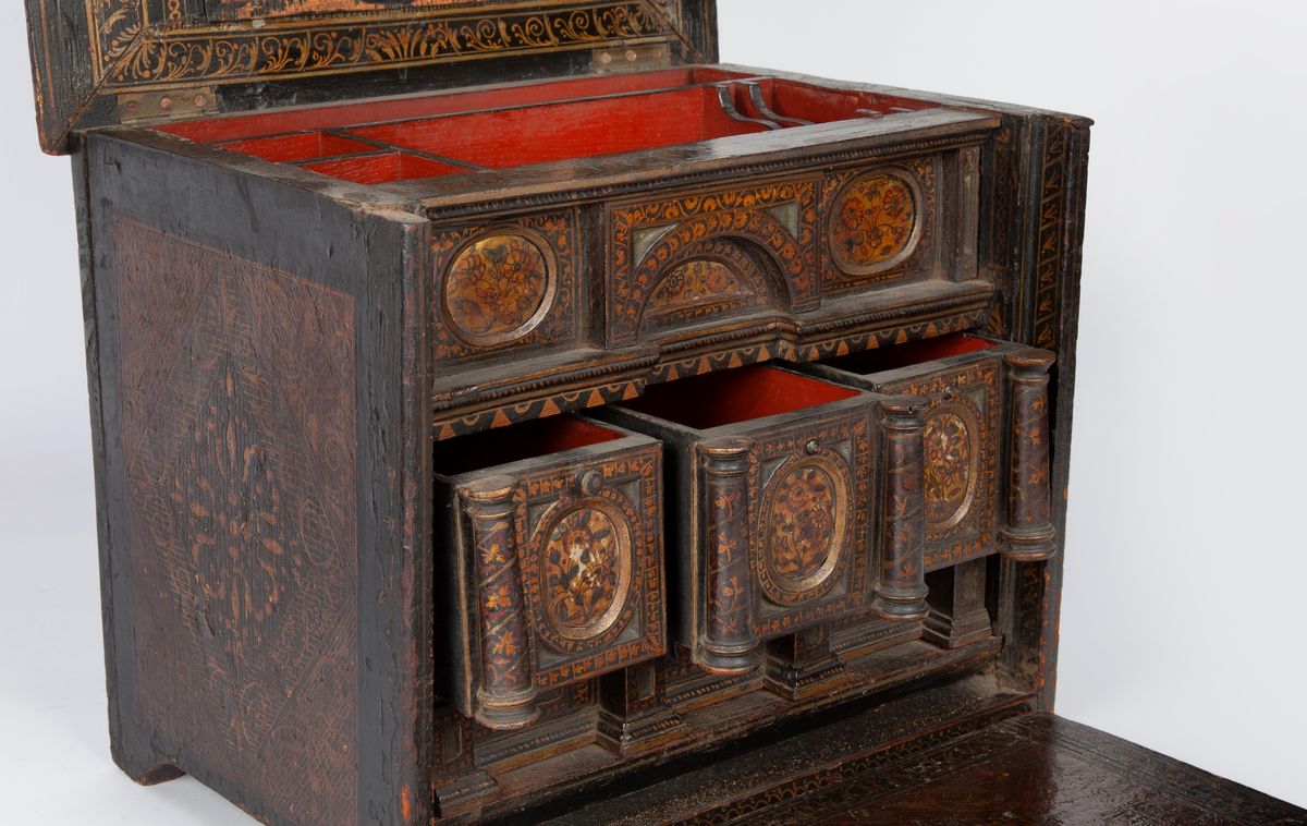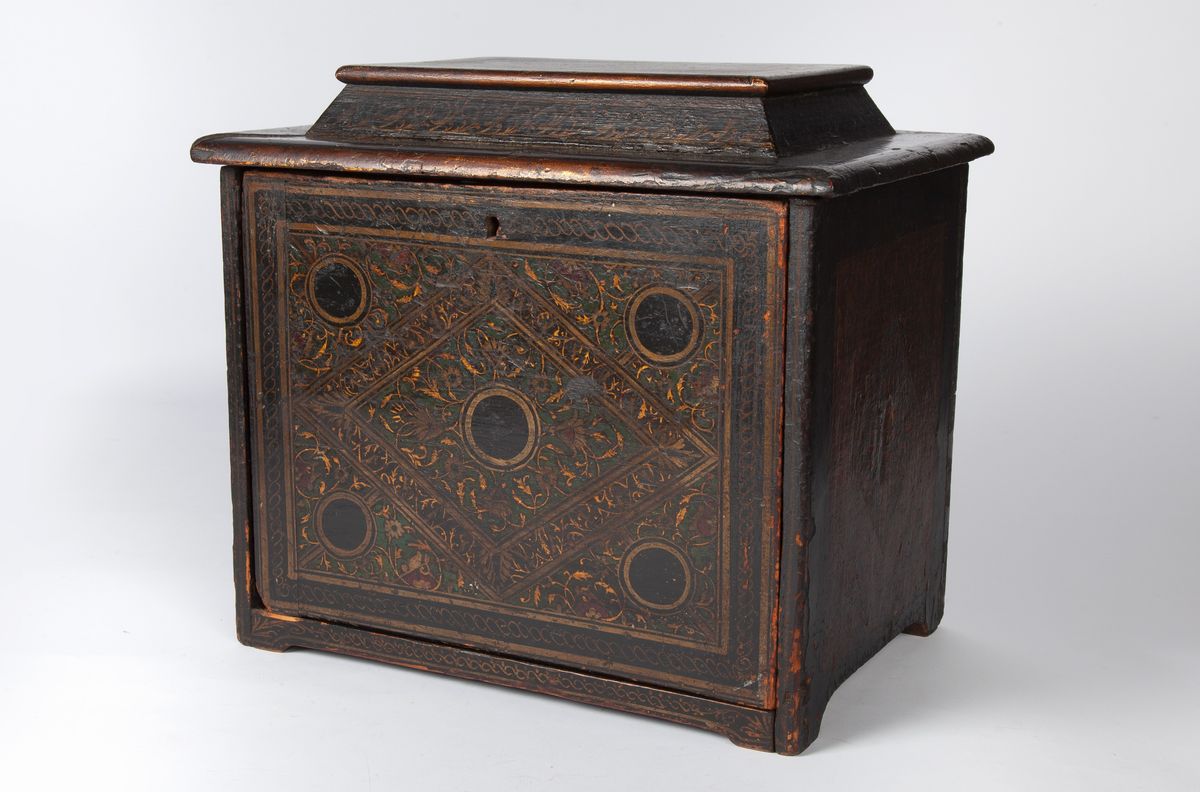 finemente decorato da girali e fiori minuziosamente dipinti in oro entro partizioni geometriche; coperchio incernierato con specchio al verso con scomparti di diversa forma e misura ed un piccolo tiretto; pannello frontale scorrevole a celare una facciata di gusto architettonico suddivisa in quattro cassetti