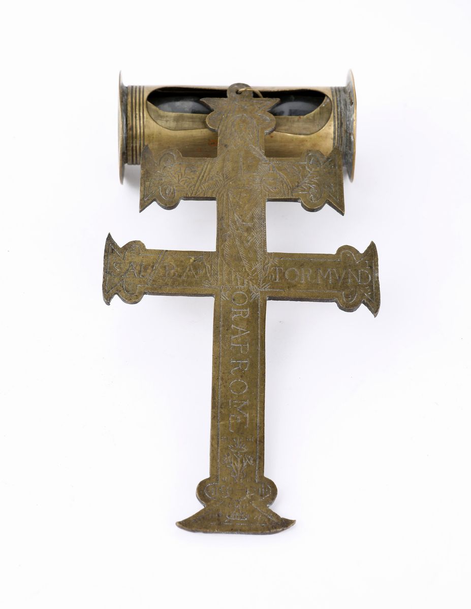 un calice in bronzo, una croce pettorale in ottone di gusto medievale a due bracci decorata su entrambe le facciate ed una clessidra in ottone con Cristogramma IHS alle due estremità e meccanismo di chiusura girevole a scomparsa