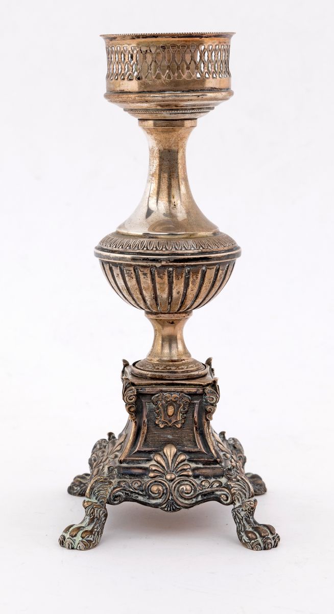 Antico candeliere in lamina d'argento sbalzata