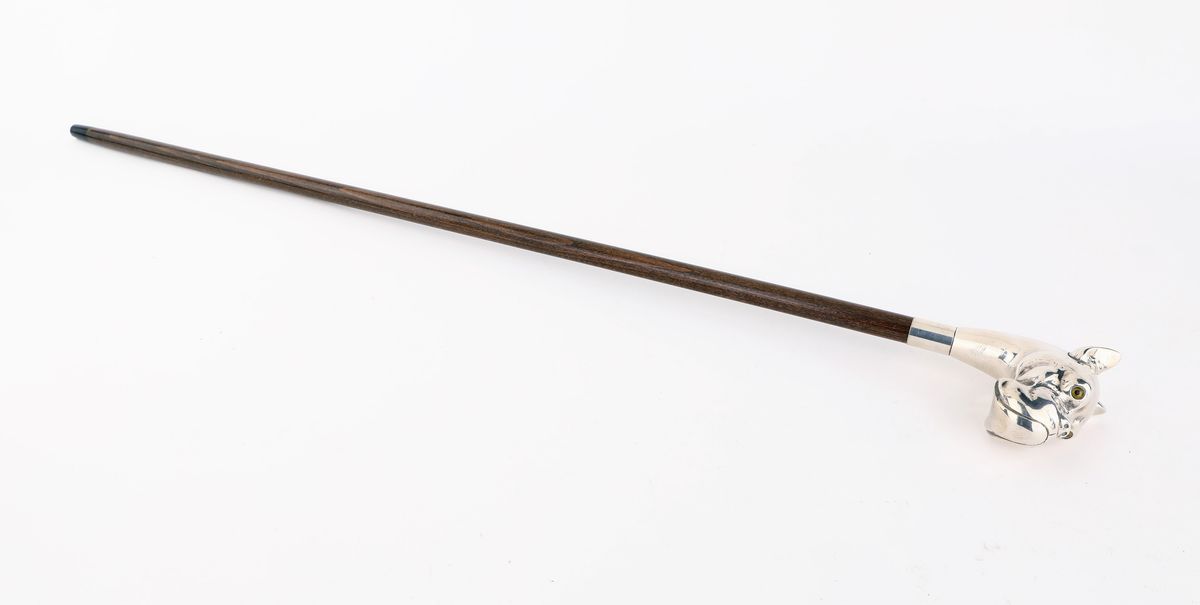 impugnatura in argento 925 a forma di testa di cane boxer con occhi in vetro giallo