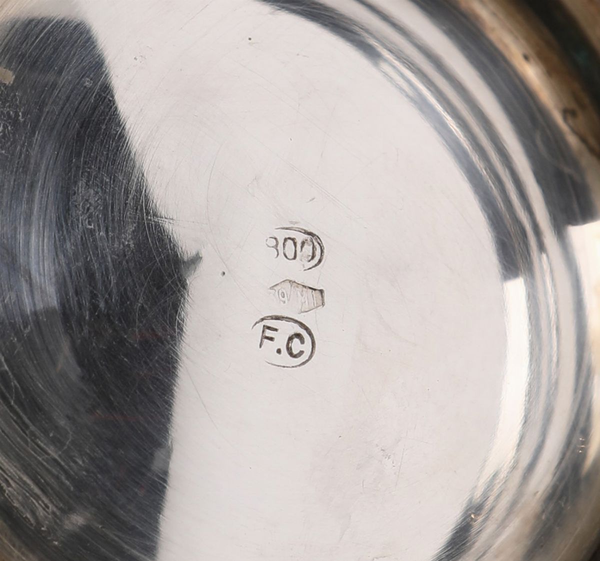 decorato da una fascia zigrinata con ghirlande, nasri svolazzanti e fiori; manico sagomato, piede circolare