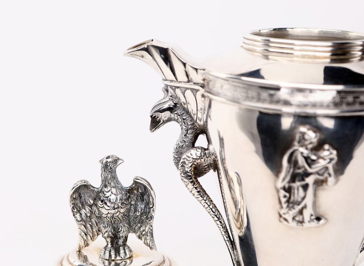 con corpo a tronco di cono decorato da figure di vestale in bassorilievo diametralmente opposte; coperchio sormontato da un'aquila ad ali spiegate, versatoio a mensola sorretto idealmente da un serpente con testa di rapace, manico in legno ebanizzato con attacco zoomorfo, piede circolare con palmette incise