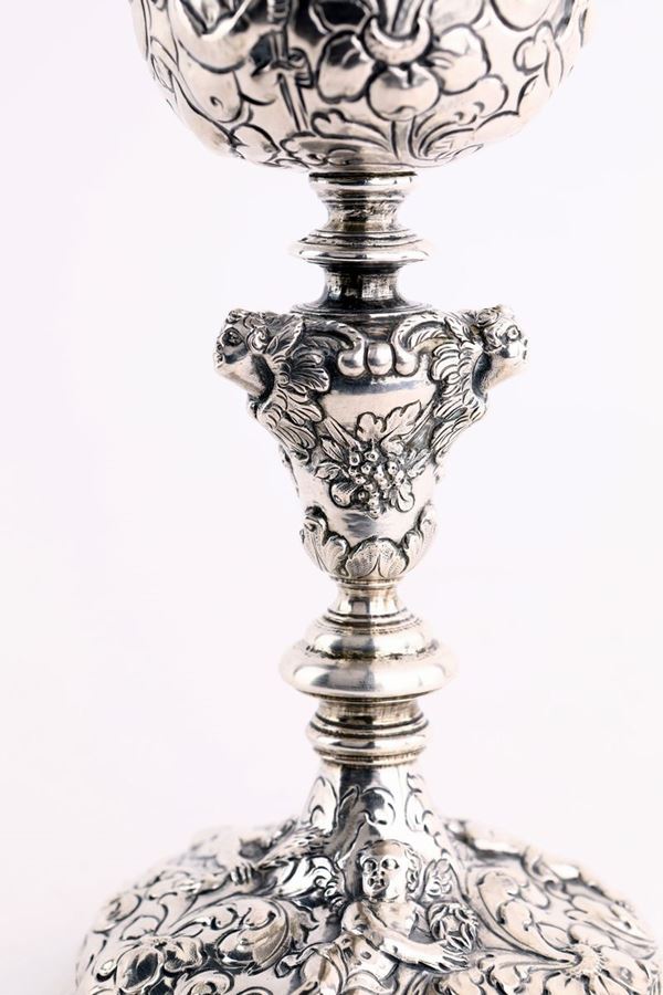 con fitta decorazione sbalzata e cesellata in forma di volute, motivi vegetali, fiori e teste di cherubino; interno dorato, fusto a balaustro su piede circolare