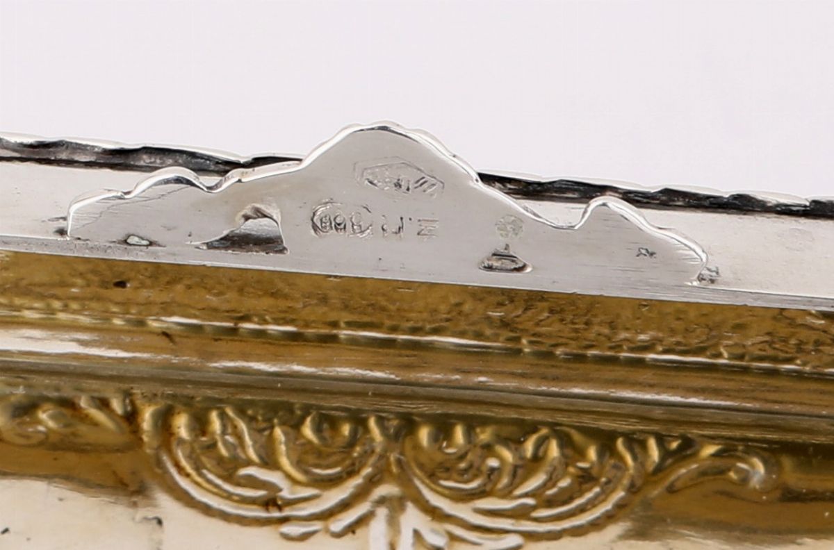 di forma rettangolare con coperchio centrato da gemma cabochon di lapislazuli emergente da una losanga di volute su fondo satinato; motivi vegetali incisi disposti agli angoli completano la descrizione. Reca dedica incisa sotto la base