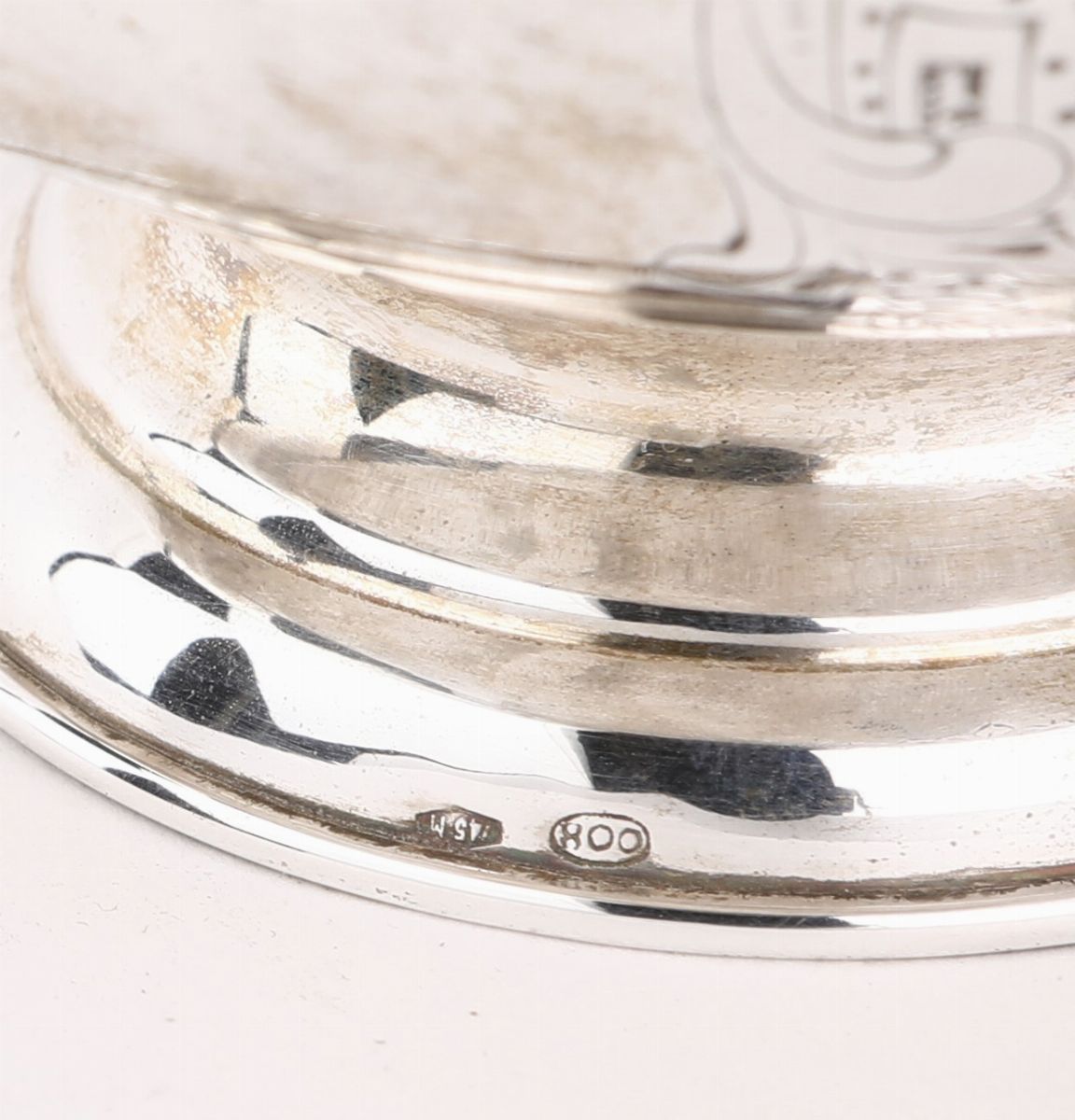 decorata da stemmi nobiliari incisi diametralmente opposti; piede circolare e coperchio sormontato da trottola