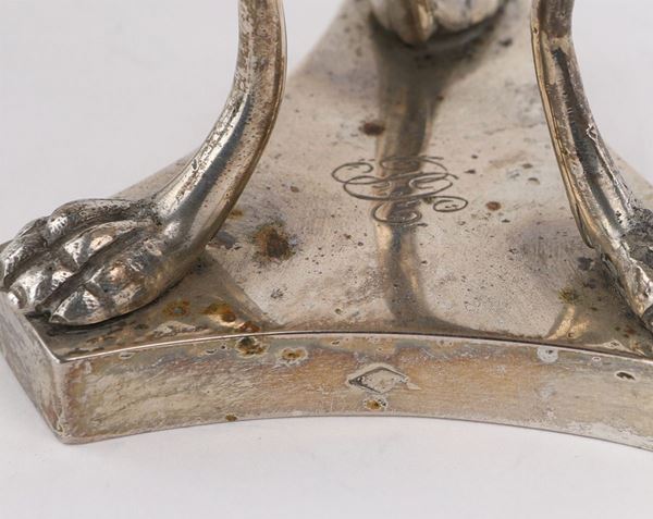 con vaschetta estraibile dorata trattenuta da anello con palmette cesellate; sostegni arcuati terminanti a piede ferino su base trilobata con monogramma inciso