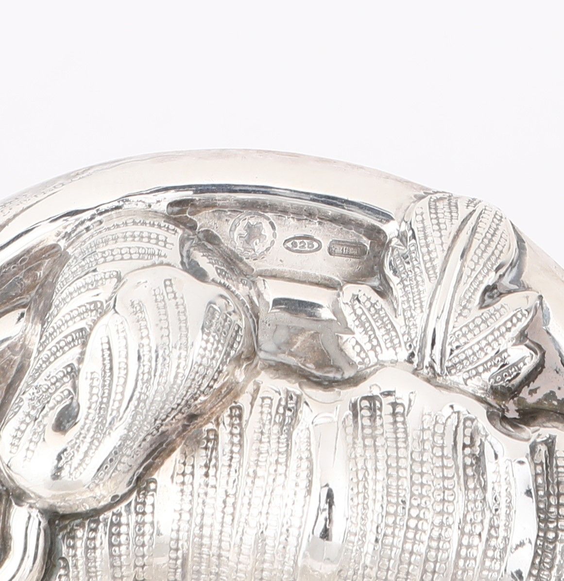 a forma di corolla con piccolo fiore sbalzato al centro del cavetto e due lunghi tralci con boccioli ai lati
