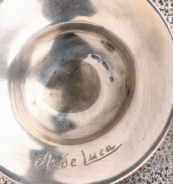 decorata in bassorilievo da tralci di vite con grappoli emergenti da superficie grezza; basso piede circolare. Firmata sotto al piede: A. de Luca