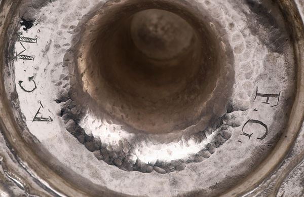 dalle simili caratteristiche decorative, con piede circolare sagomato e gradinato con stemmi nobiliari incisi. Iniziali incise sotto al piede