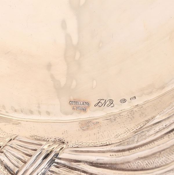 con ampia tesa decorata da fasci di spighe e bouquets fioriti sbalzati su fondo puntinato
