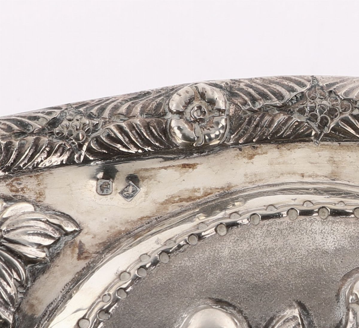 con umbone centrale liscio incorniciato da un cordolo di motivi vegetali; tre grottesche circondate da volute e fiori multiformi racchiusi entro riserve centinate completano la descrizione