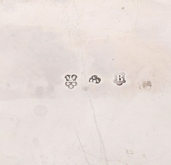 di forma rettangolare con decorazione sbalzata; coperchio incernierato raffigurante San Giorgio, fascia con piccole composizioni di frutta alternate a paesaggi con architetture