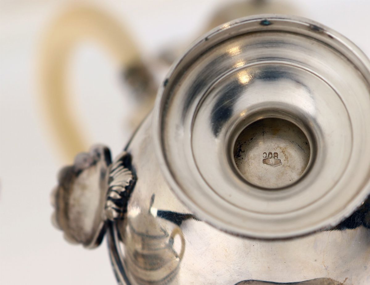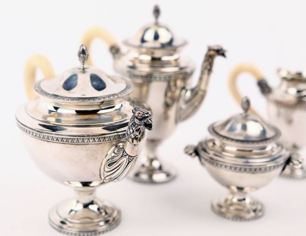 con corpi lisci su piede circolare, scanditi da profili cesellati a palmette; coperchi a cupolino sormontati da ghianda, la caffettiera e la teiera con versatoio sagomato e beccuccio zoomorfo; manici sagomati con attacchi a mascherone