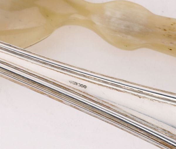 12 cucchiai, 12 forchette ed altrettanti coltelli da pasto, 12 forchette ed altrettanti coltelli da frutta, 12 cucchiaini da caffè, forchetta e cucchiaio da portata, un mestolo, due posate da insalata in argento e corno