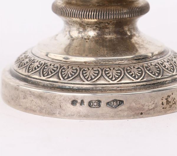 a forma di coppa con coperchio su piede circolare, decorati da palmette e motivi a scaglie cesellati; manico sagomato con terminale in forma di testa equina