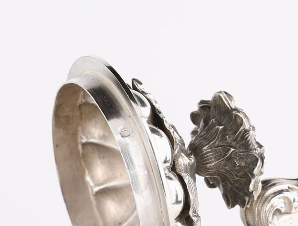 con corpo baccellato su quattro piedini a ricciolo; versatoio e manico sagomati arricchiti da rilievi vegetali, coperchio incernierato entro apertura dai margini mistilinei, dominato da presa scultorea in forma di fiore emergente da una composizione di rami recisi