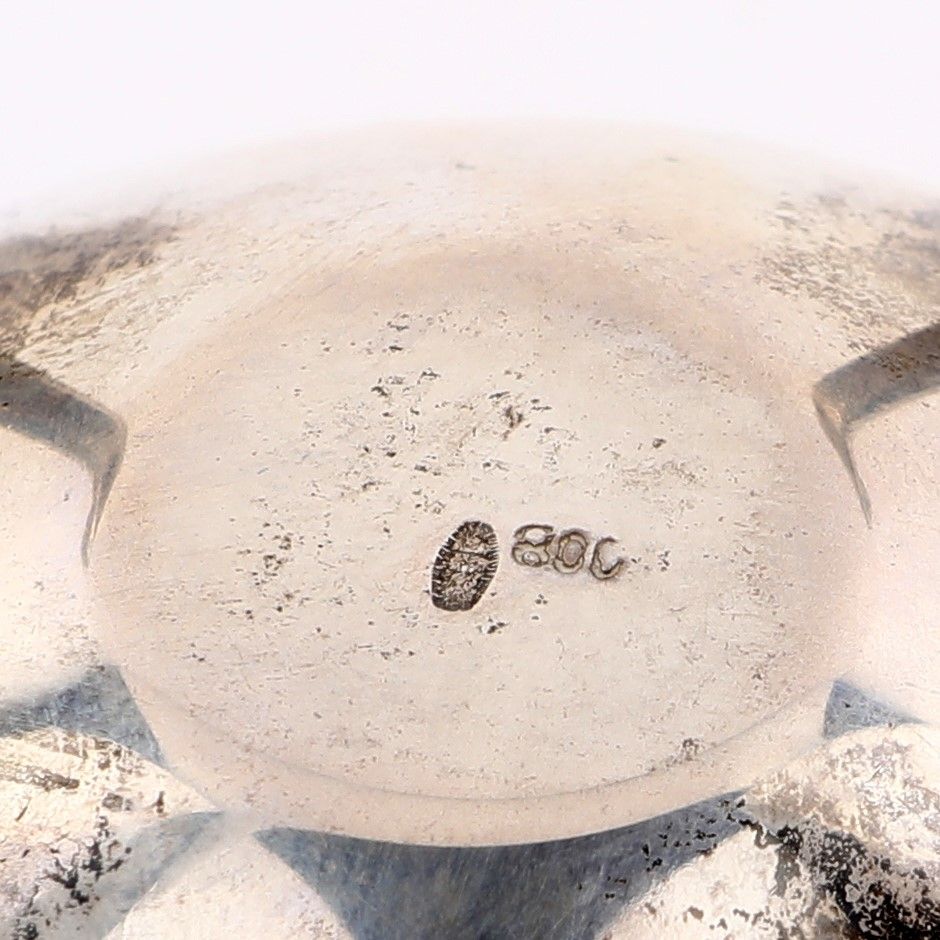 a forma di uovo con coperchio sormontato da pigna; esili manici sagomati, piedi a zampa ferina. Con cucchiaio a paletta in metallo argentato