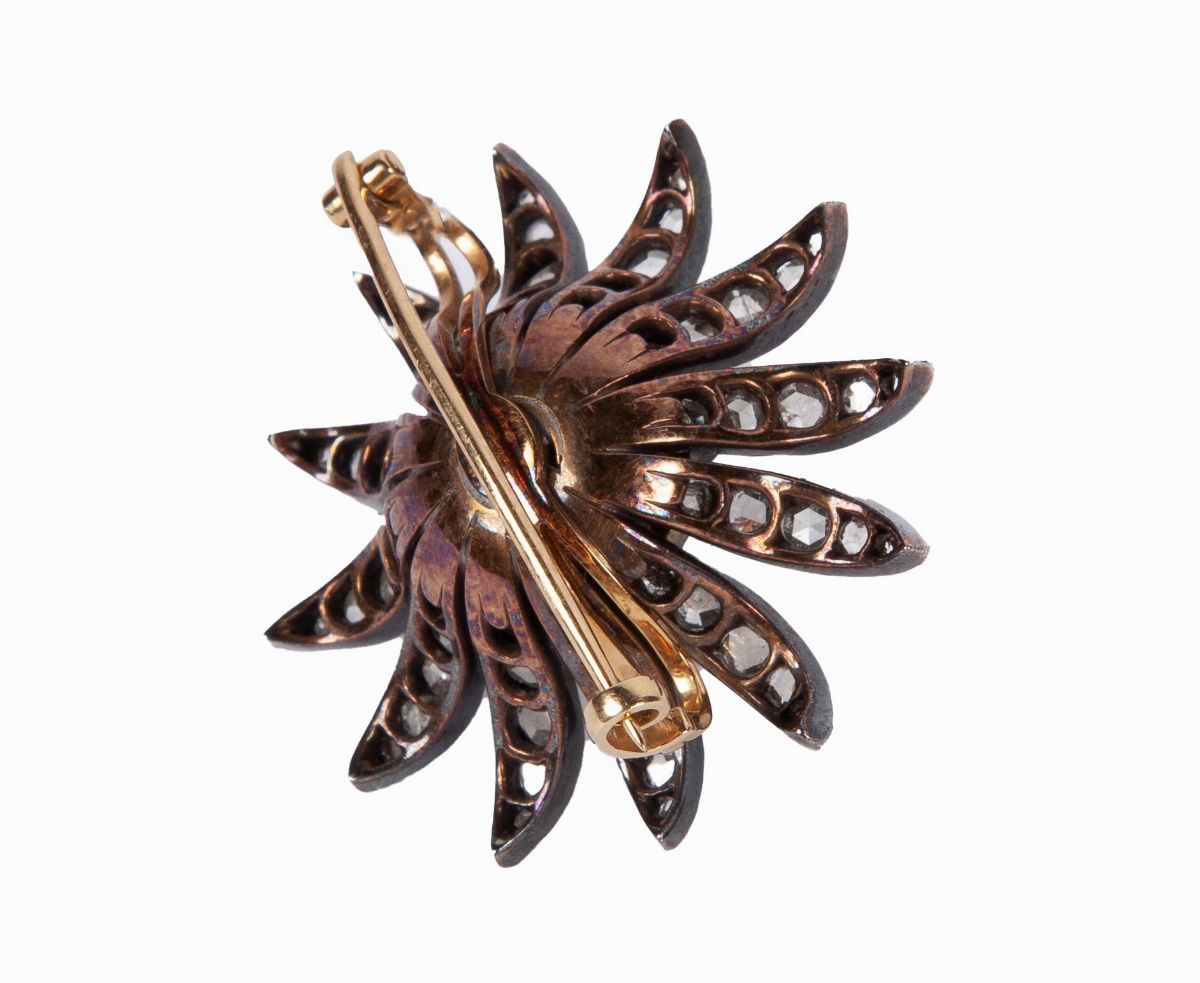 Spilla antica a fiore in oro e argento e diamanti