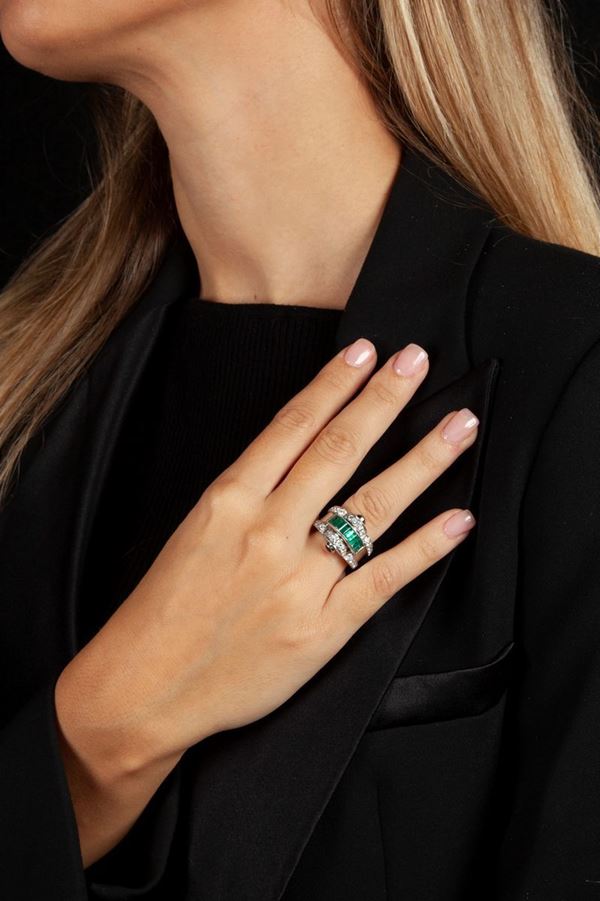 Oro bianco 750/000. Smeraldi in taglio baguettes, diamanti in taglio brillante. Peso complessivo gr. 18,50.