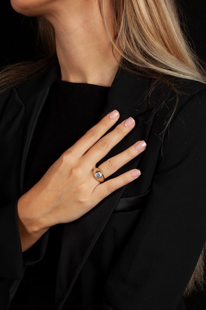 Oro giallo e bianco 750/000. Diamante naturale taglio rotondo brillante, ct. 1,67; prob. I-VSI. Reca all'interno incisione con caratura. Peso complessivo gr. 9,80.