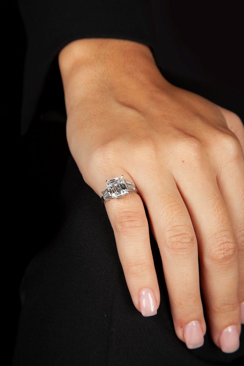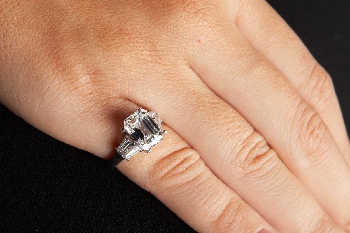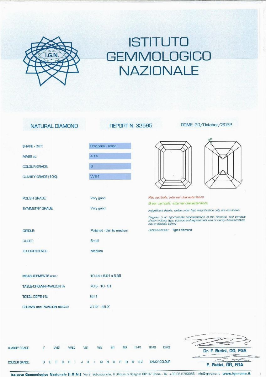 Montatura in oro bianco 750/000, diamante taglio ottagonale. ct. 4,14 G VVS1 (smontato).