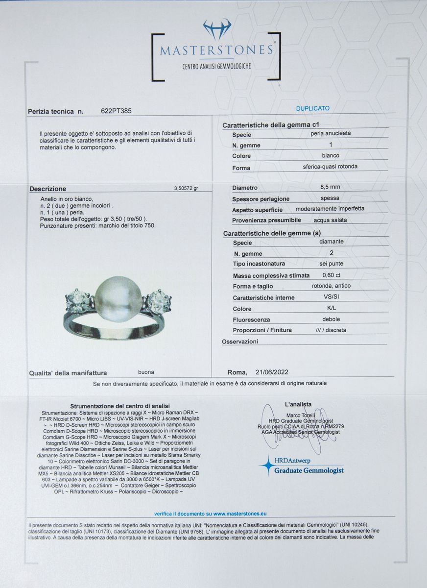 Oro bianco 750/000; due diamanti in taglio vecchia Europa, ct. 0,60 K/L VS/SI. Una perla anucleata spontanea di acqua salata di 8,5 mm. Peso complessivo gr. 3,50.