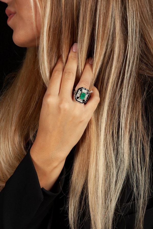 Anello in oro con smeraldo, brillanti e onice