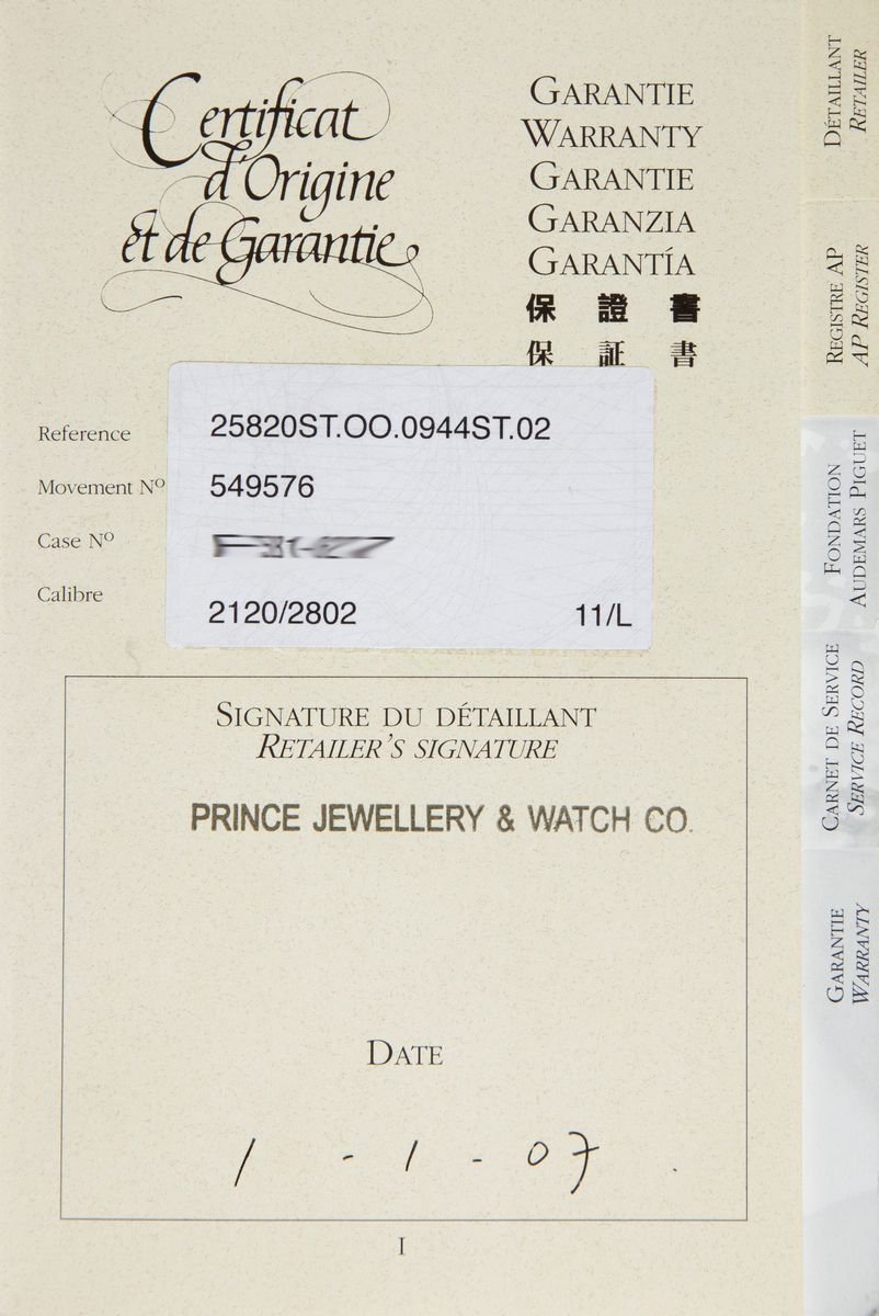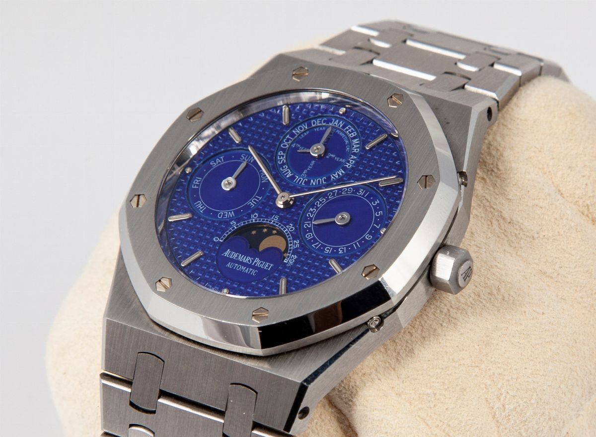 Ref. 25820ST.OO.0944ST.02. Modello Royal Oak Perpetual Calendar, quadrante Yves Klein, codice 02 (specificato in garanzia). Cassa in acciaio mm 39, bracciale in acciaio, movimento automatico, calibro 2120/2802. Compreso di scatola, garanzia, Audermas Piguet Extrait de Registre.