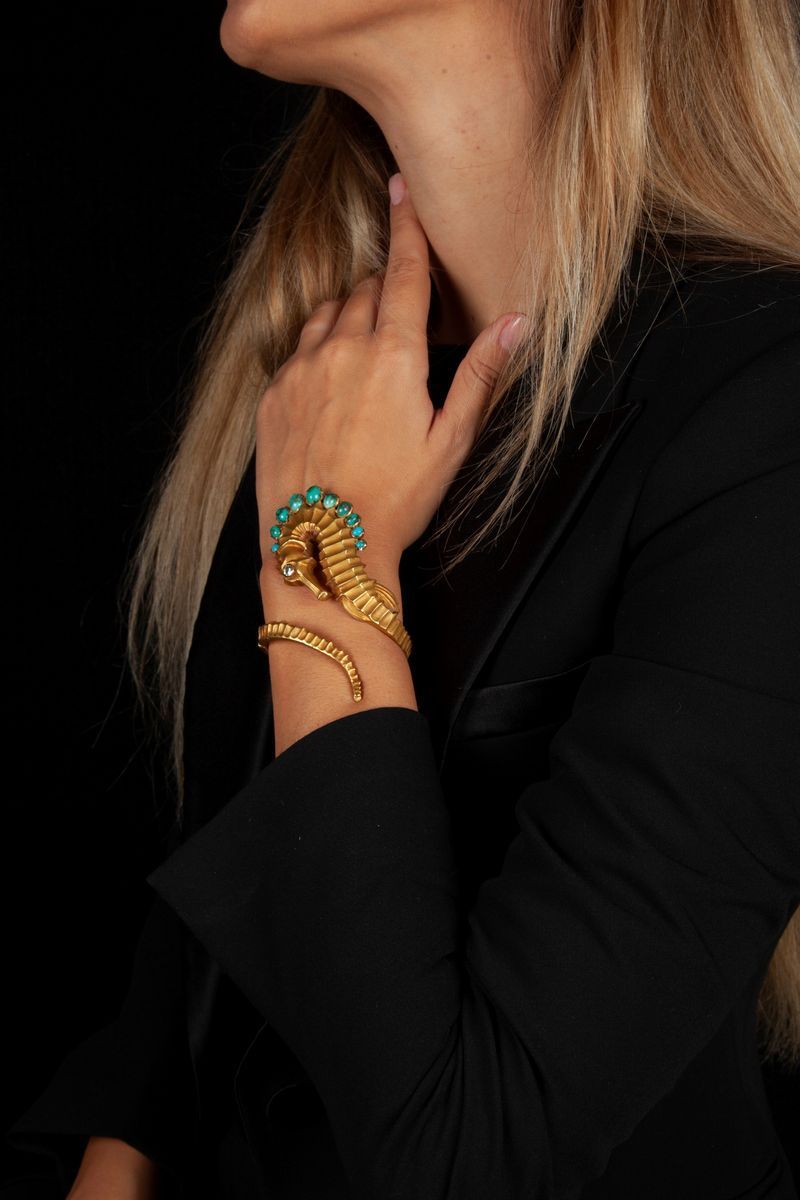 Bracciale cavalluccio marino, oro diamanti e turchese