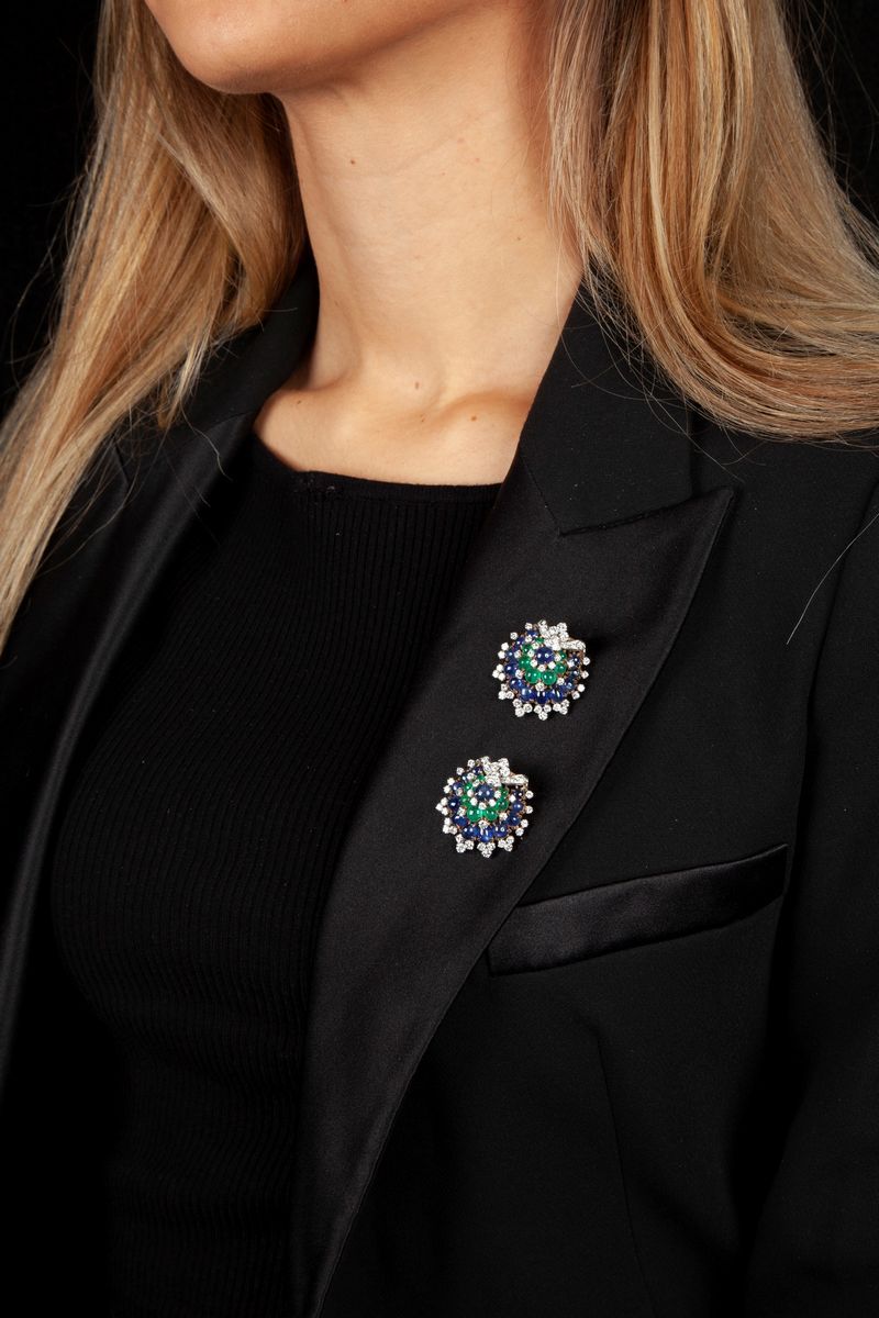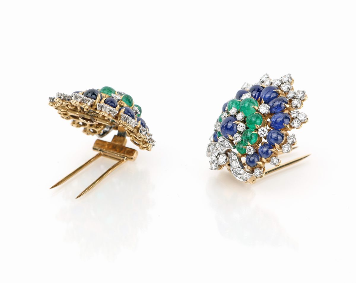 Bulgari - Coppia di spille anni '60 in oro, zaffiri, smeraldi e diamanti