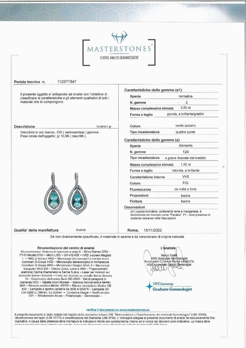 Oro bianco 750/000. Tormalina Paraiba ct. 3,50 forma a goccia, diamanti ct. 1,50. Peso complessivo gr. 10,96.
