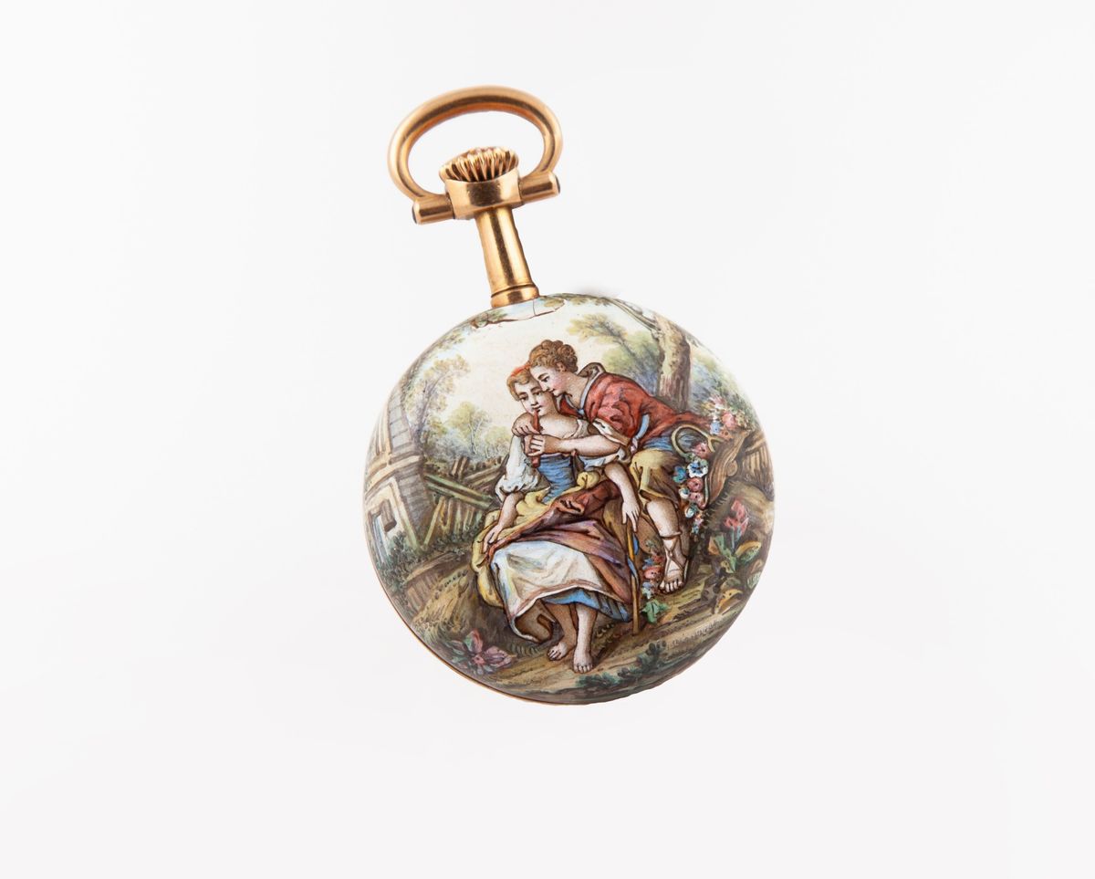 Oro giallo 750/000, estraibile dalla custodia in oro. Piccolo difetto all'apice dello smalto.