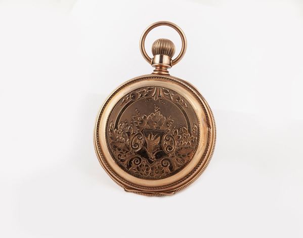 Casse e controcasse in oro a basso titolo. Casse e controcassa numerate 517731; meccanismo P.S.Bartlett-Waltham Mass. a cilindro numerato 3140472. Cassa incisa a decori floreali con uccellino su stemma.