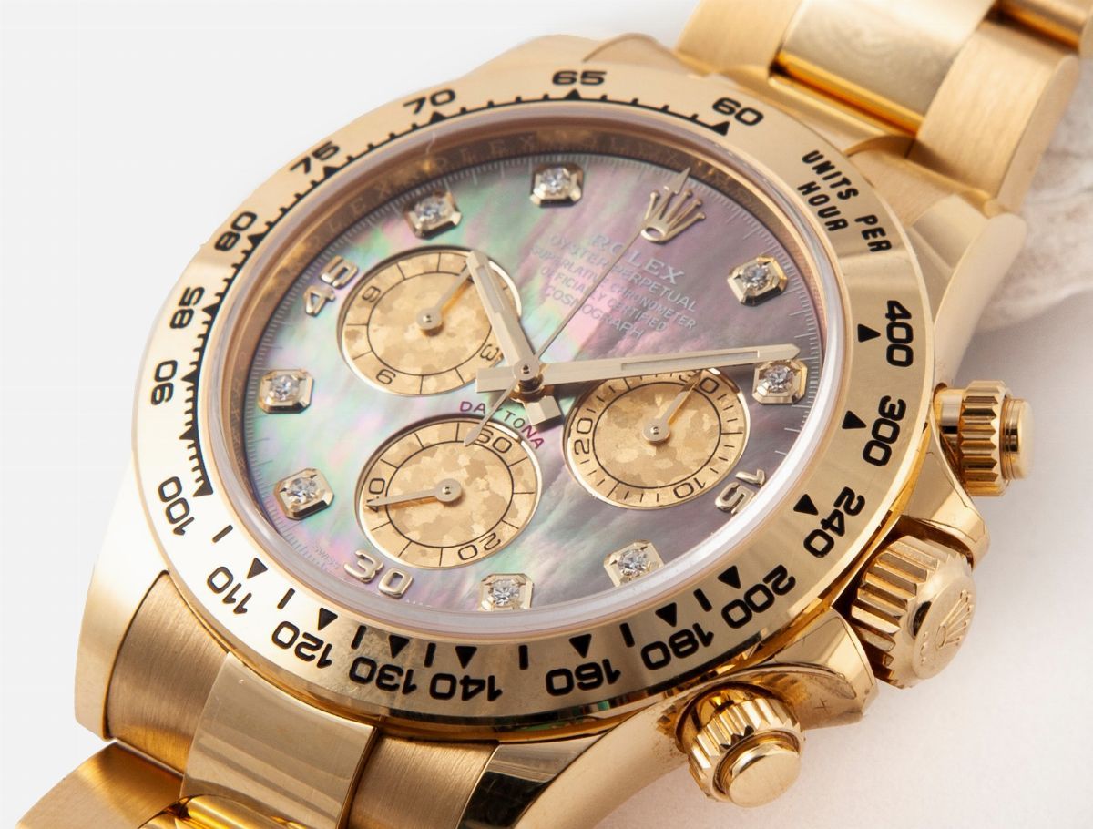 Ref. 116508. Cassa in oro giallo 750/000 mm 40, quadrante in oro, madreperla, diamanti e cristallo. Movimento automatico, calibro 4130. Compreso di scatola e garanzia.