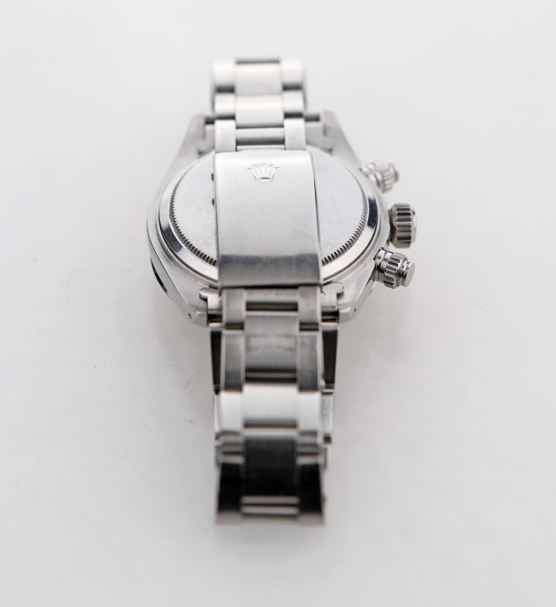 Ref. 6265, cassa in acciaio mm 39, bracciale Oyster ref. 78350 con finali 571, quadrante "Big Red". Movimento meccanico a carica manuale con cronografo, calibro 727.