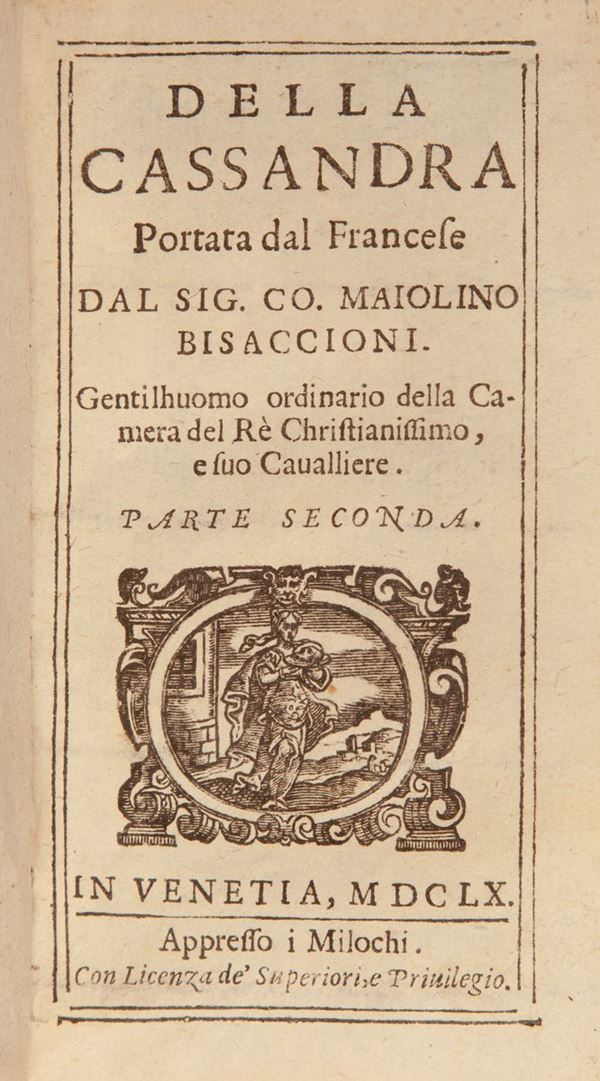 Gautier De Coste Sieur de La Calprenede. Della Cassandra portata dal Francese dal sig. Co Maiolino Bisaccioni. Solo parte seconda. Appresso i Milochi, Venezia 1660. In 16° piccolo (cm 15x9). Traduzione italiana dal francese del romanzo d'avventura "Cassandre" di Calprenede uscito in 10 voll. dal 1642 al 1660, dove l'autore rievoca nei nomi di antiche vicende eroiche i costumi di epoche contemporanee.