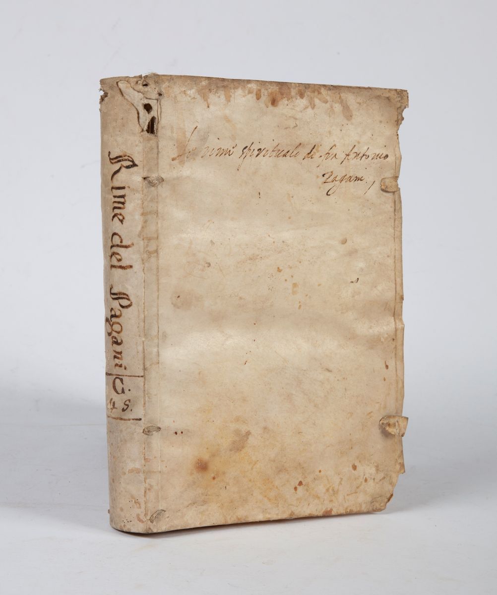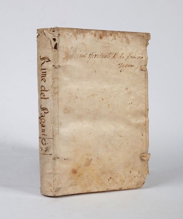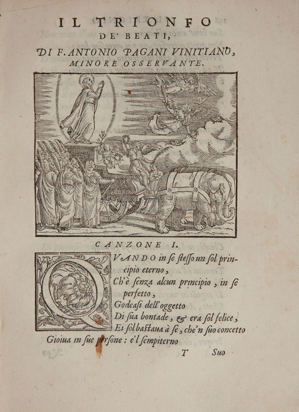 In 8° Non comune raccolta delle opere del padre barnabita veneziano (stampate in parte dal 1554 al 1557), arricchita da deliziose illustrazioni nel testo basate sulle raffigurazioni dei Trionfi del Petrarca. Legatura in piena pergamena coeva con titolo manoscritto al dorso e al piatto. Strappi alle carte bianche.