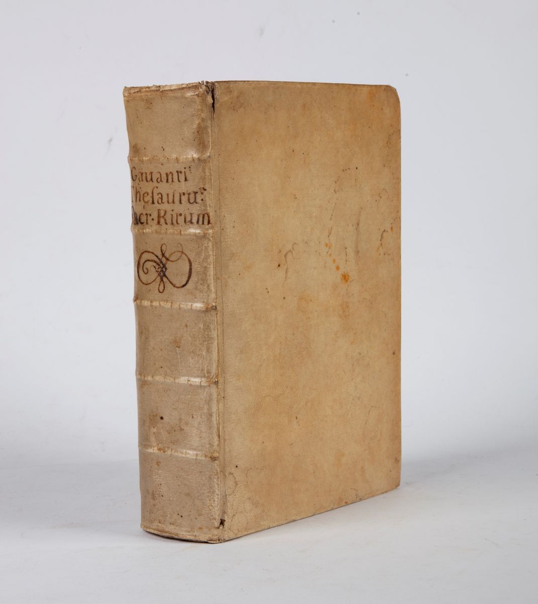 In 8° Quattro opere ognuna col proprio frontespizio in cinque parti legate in un volume. Opera del barnabita milanese nella quale vengono tracciate le origini storiche dei sacri riti ed i loro significati mitici e vengono delineate le osservanze e gli obblighi. Sono aggiunti decreti e prassi fino al pontificato di Innocenzo XI in questa edizione veneziana ampliata dal barnabita Paolo da Venezia. Legatura in piena pergamena con 5 nervi e titolo manoscritto al dorso. Tagli spruzzati.