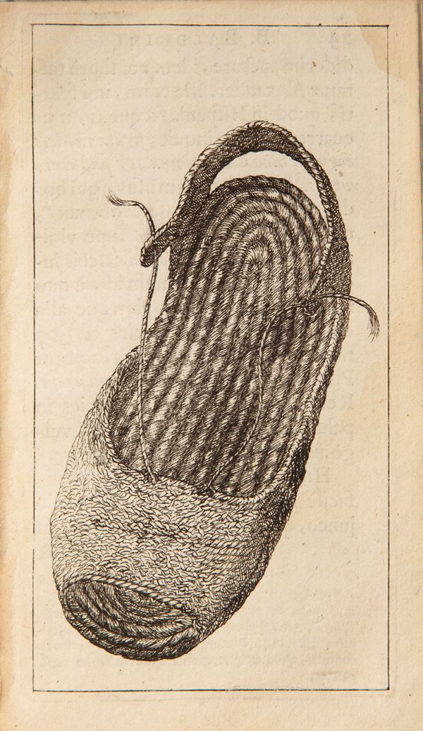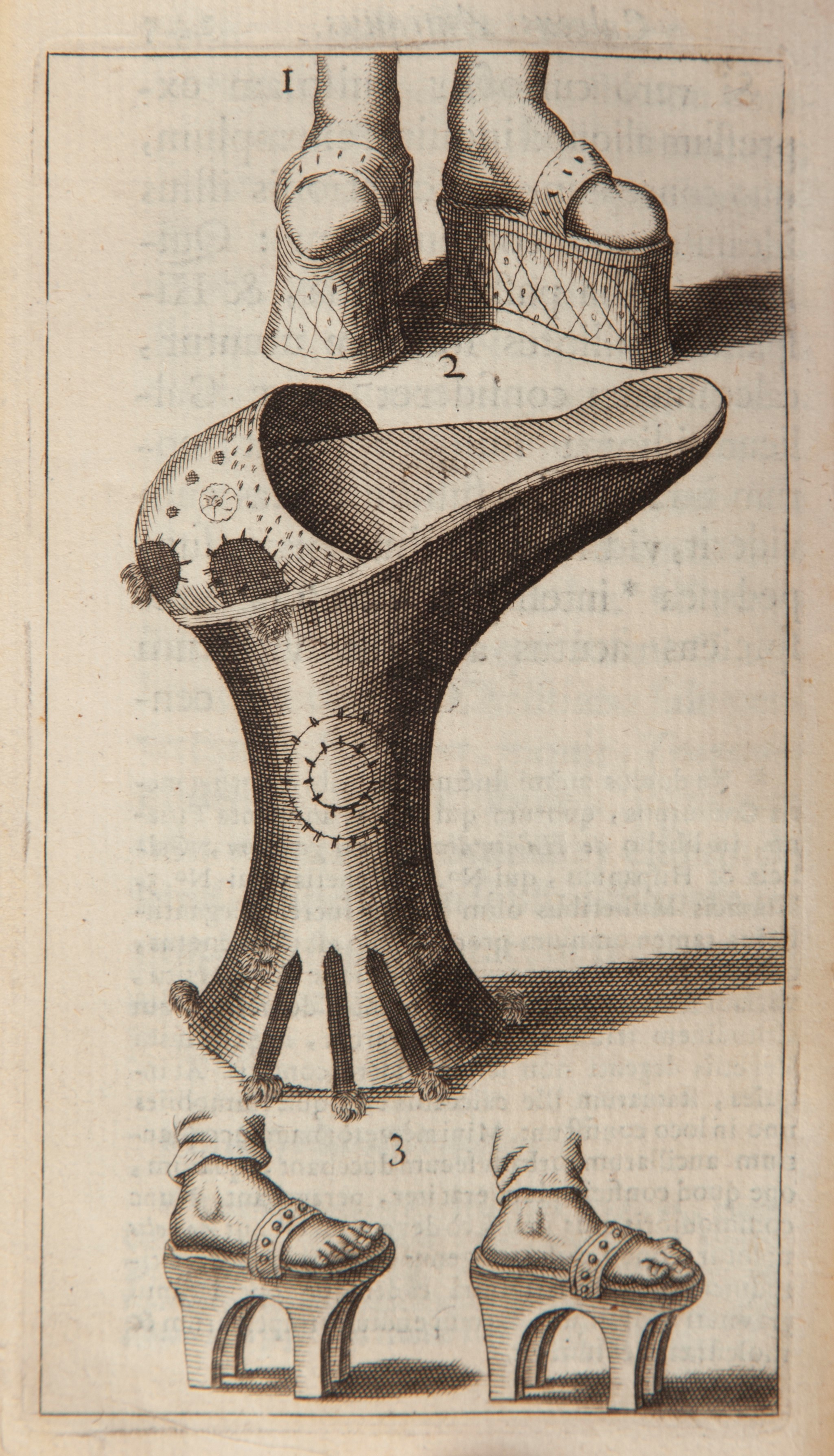 In 24° grande. Prima edizione di quest'opera rara sulle calzature dai tempi antichi fino al medioevo. Antiporta figurata con incisione in rame di Hendrick Bary. Solo 13 tavole incise a rame su 28, raffiguranti fogge di calzature e personaggi che le indossano. Legatura in cartonato coevo rivestito in carta dipinta con titoli manoscritti al dorso. Lotto non passibile di restituzione.