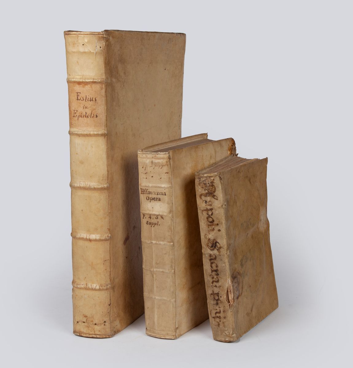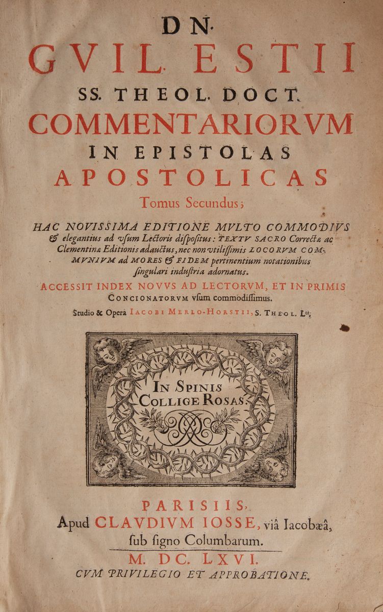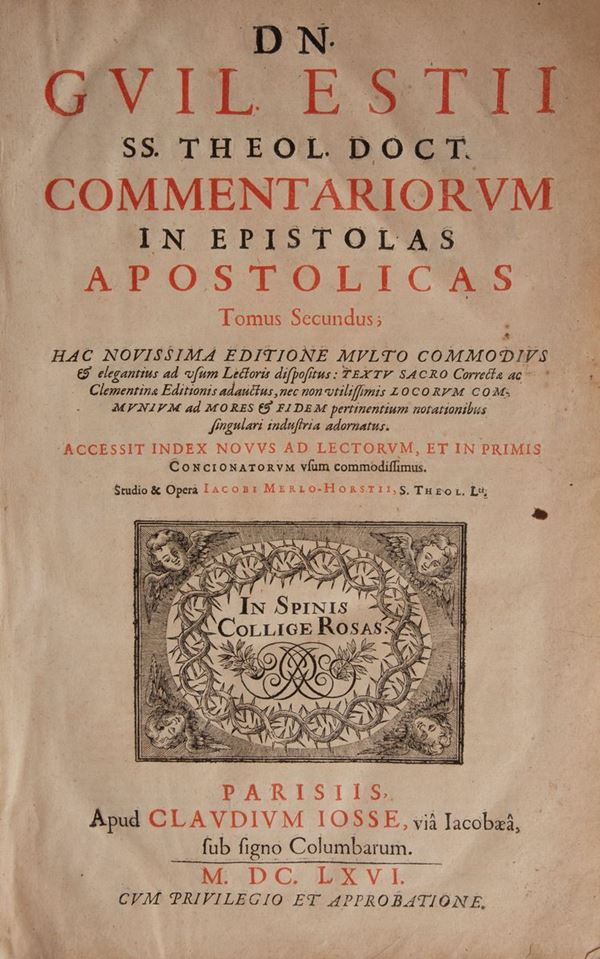 1 - Guilielmo Estio (Guilielmus Estius). Commentariorum in epistolas apostolicas. Claudio Iosse Parigi 1666. Solo tomo secondo dell'opera in 2 volumi "Absolutissima in omnes beati Pauli et septem catholicas apostolorum Epistolas commentaria tribus tomis distincta. In quibus genuinus litterae sensus solide & perspicue traditur". In Folio cm 38x24,5 Piena pergamena coeva con 5 nervi e titolo manoscritto al dorso.
