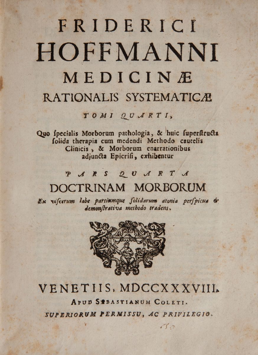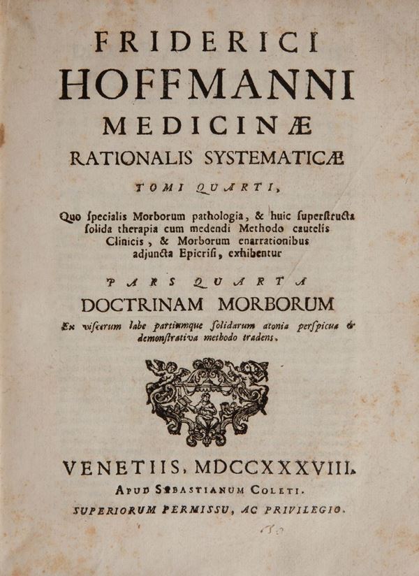 2 - Federico Hoffmann, Medicinae Rationalis Systematicae. Pars Quarta. Sebastiano Coletti Venezia 1738; legata con Pars Quinta. Sebastiano Coletti Venezia 1741; legata con Supplementum et Vita Autoris. Sebastiano Coletti Venezia 1741. Raccolta delle teorie del celebre professore di medicina a Halle e medico alla corte di Federico I, creatore del sistema razionale su fondamento meccanico. In 8° cm 23x18,5 Legatura in piena pergamena coeva (difetti) con 7 nervi e titolo manoscritto al dorso.