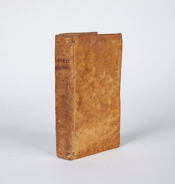 In 24° grande. Quarta edizione con nuova aggiunta dell'opera principale del misconosciuto poligrafo marchigiano Carlo Moscheni. Raccolta fittizia di lettere di animali a carattere gnomico e moralistico. Carte leggermente brunite. Legatura in piena pergamena coeva, titolo manoscritto al dorso.
