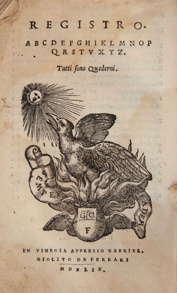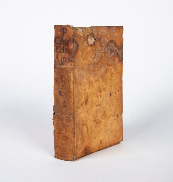 In 16° piccolo. Traduzione dal greco di Pietro Lauro delle 'Geoponiche' (raccolta di scritti antichi dei Greci sull'agricoltura, raccolti e rielaborati intorno al 950 d.C. per volere dell'imperatore Costantino Porfirogenito che affrontano temi legati al vino, alla preparazione del miele, dell'olio e sulla gastronomia, notizie su come preparare esche per la pesca di fiume e di mare, sull'allevamento di pecore, mucche e cavalli). Legatura in piena pergamena coeva floscia (difetti, mancanze, abbondanti gore). Lavori di tarlo. Titolo manoscritto al dorso.