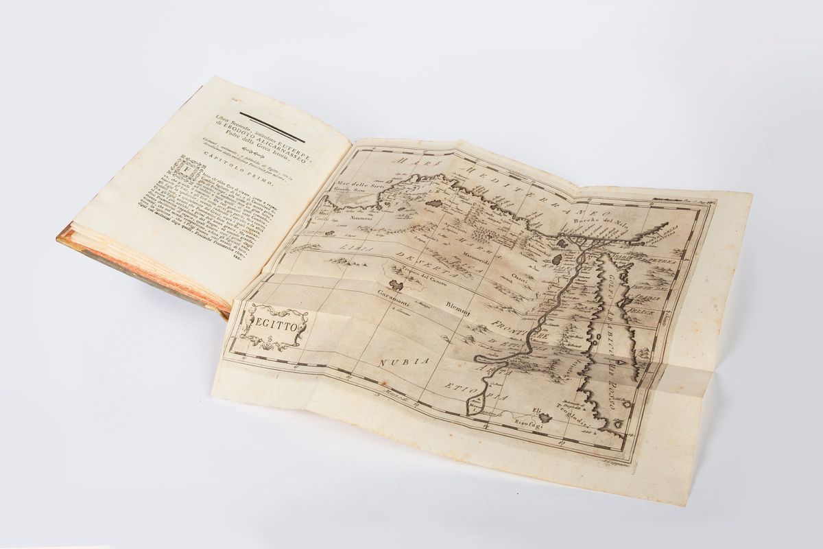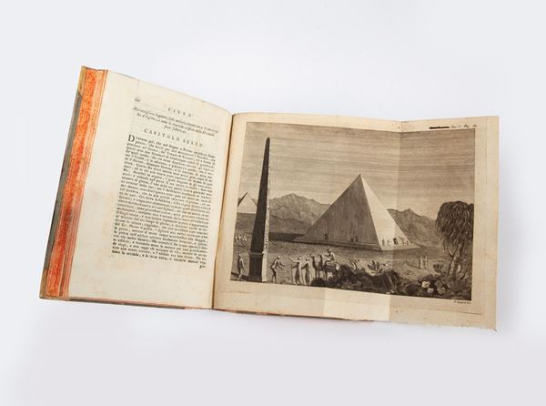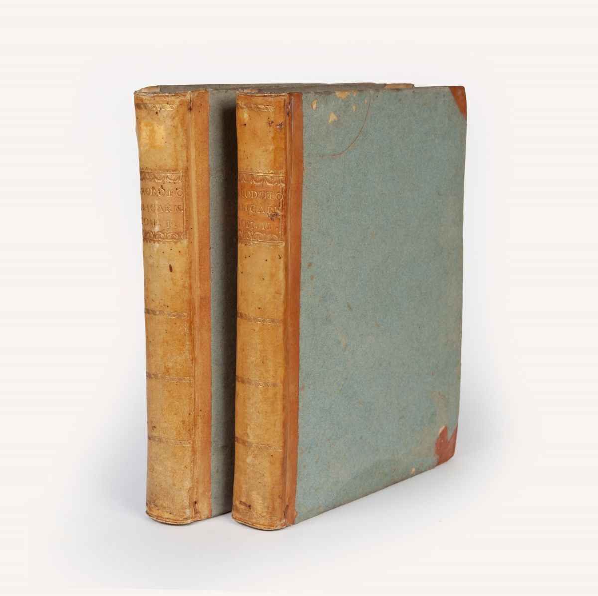 Due volumi in 8°. Prima edizione italiana della traduzione di Tommaso Porcacchi delle Storie di Erodo di Alicarnasso con sei incisioni di cui due tavole, più volte ripiegate, con veduta dell'Egitto e pianta dell'Egitto, e una pianta della Grecia. Legatura in mezza pergamena, angoli in pergamena, titoli e fregi in oro al dorso, tagli spruzzati. Tracce di tarlo ai dorsi che interessano marginalmente i frontespizi.
