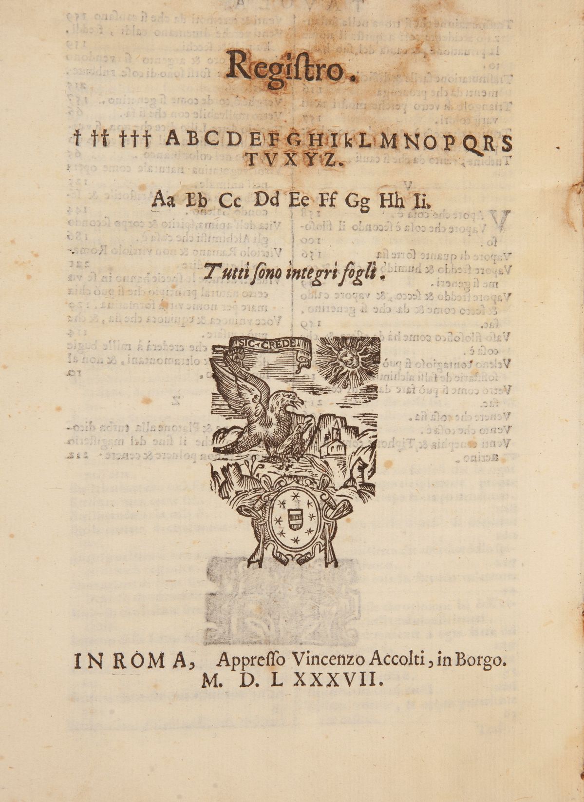 Evangelista Quattrami. La vera dichiaratione di tutte le metafore, similitudini, e enimmi degl'antichi Filosofi Alchimisti, tanto Caldei e Arabi, come Greci e Latini, usati da loro nella descrittione, e compositione dell'Oro potabile, Elissire della vita, Quinta essenza, e Lapis filosofico, Appresso Vicentio Accolti, Roma 1587