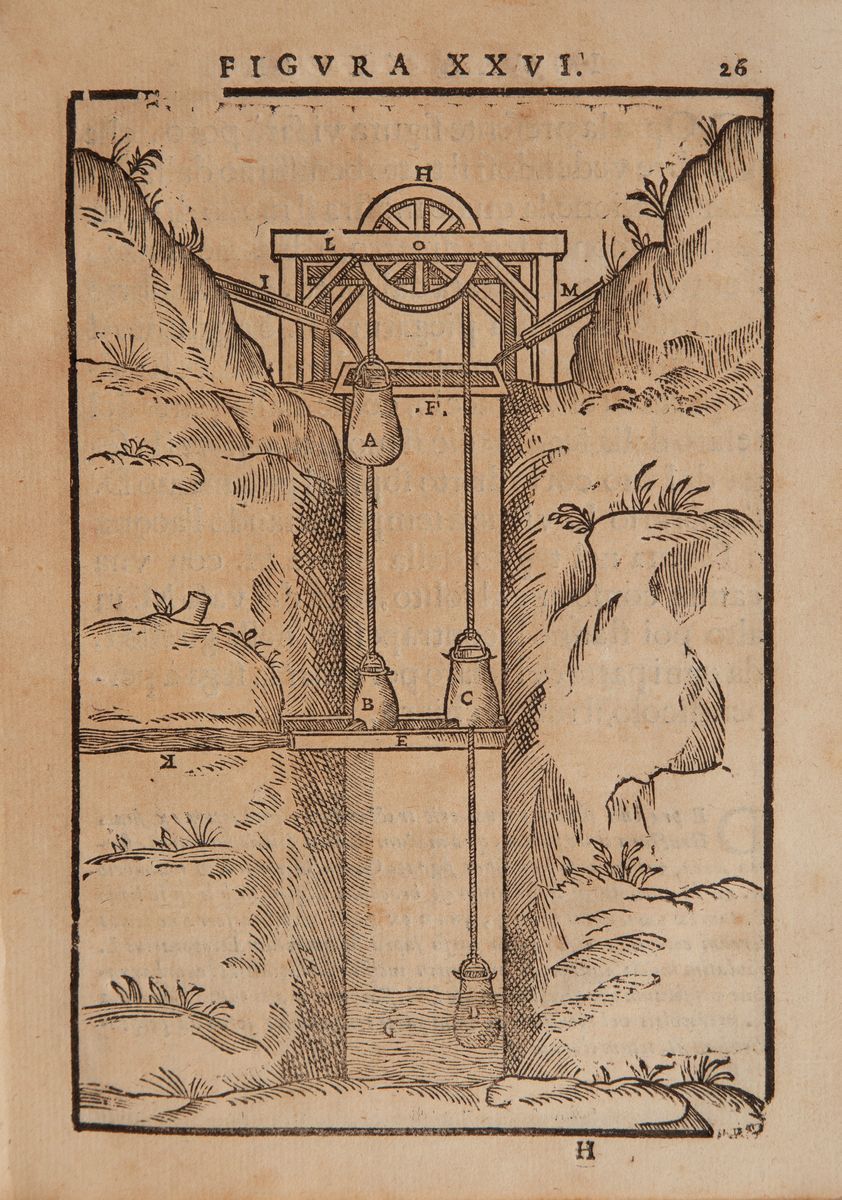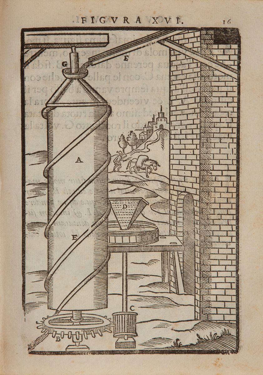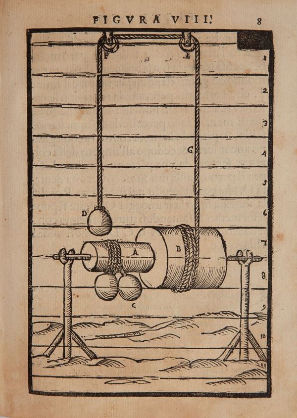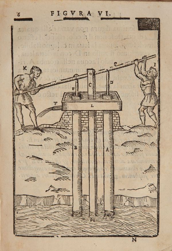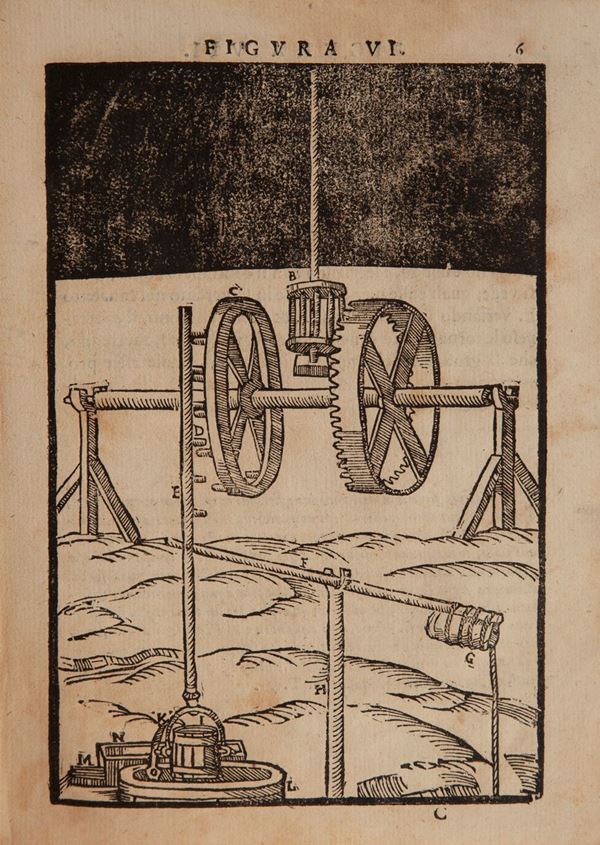In 8°. Frontespizio illustrato. Prima ed unica edizione di questa opera classica di grande rarità e scarsa diffusione. Trattato di tecnologia del seicento, precursore della tecnica meccanica moderna, dove vengono esposte moderne turbine a vapore ed altri macchinari innovativi. Esemplare completo riccamente illustrato con 77 tavole xilografiche a piena pagina. Legatura in piena pergamena coeva.