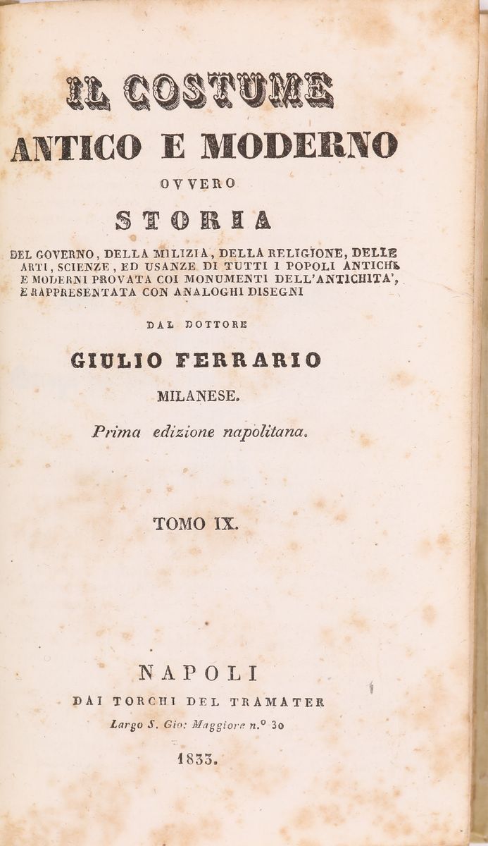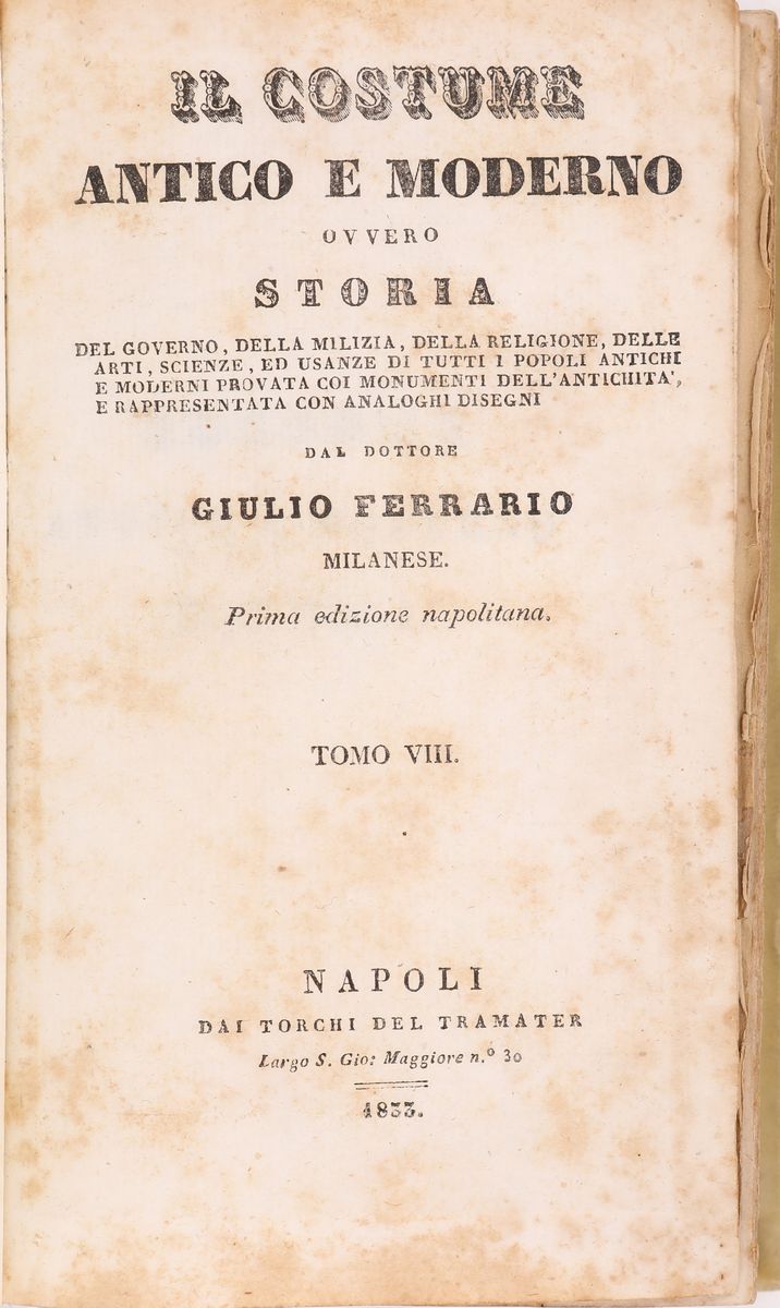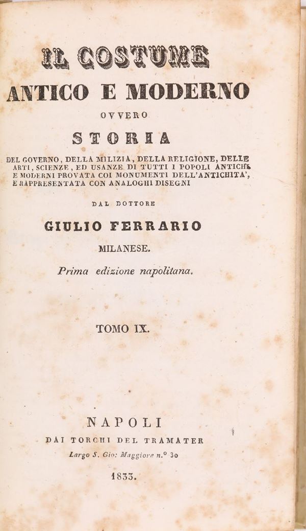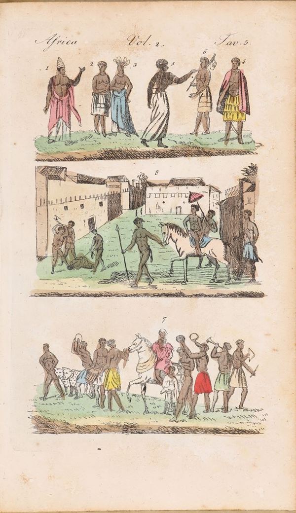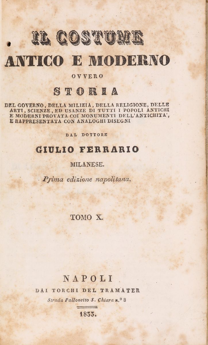 Giulio Ferrario. Il costume antico e moderno ovvero storia del governo, della milizia, della religione, delle arti, scienze ed usanze di tutti i popoli antichi e moderni... Volumi I, II e III dell'Africa, Dai torchi del Tramater, Napoli 1833